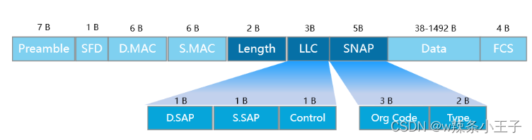 比Ethernet II多了802.2Header:LLC、SNAP,用于目的访问服务的控制字段。(了解)