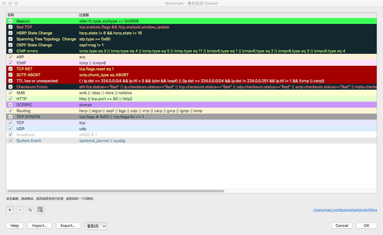 对于一个交互超长的报文,一眼望过去,白纸黑字密密麻麻,看得第一眼就头皮发麻,对于这种情况,如果不同类型的报文使用不同的颜色,看着会舒服很多,也方便辨识,对应的设定选项在“视图 -> 着色规则”中,可以自己根据需要设定过滤规则的条件,例如我设置beacon帧为绿色,那么在过滤规则中将背景色设定为绿色,那么在选中规则后,所有的beacon帧都会显示为绿色。