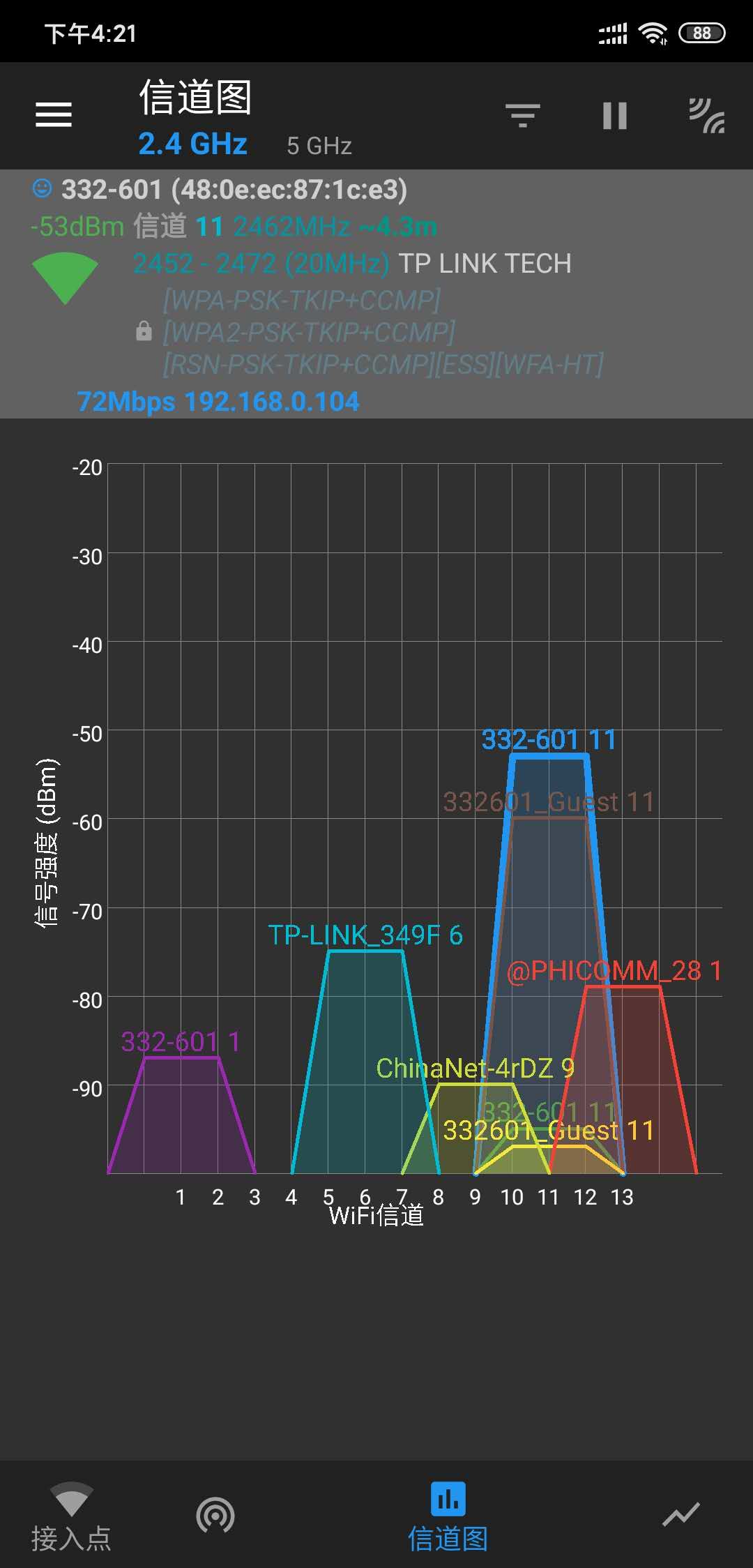 对于不知道自己想要查看的AP处于哪个信道,在能连上AP的情况下可以登陆路由器界面查看,不知道的情况这里推荐一个很好用的Wi-Fi辅助工具,叫做Wi-Fi分析助手,安卓手机找到APP下载就可以,里面会显示处扫到的AP所在的信道。