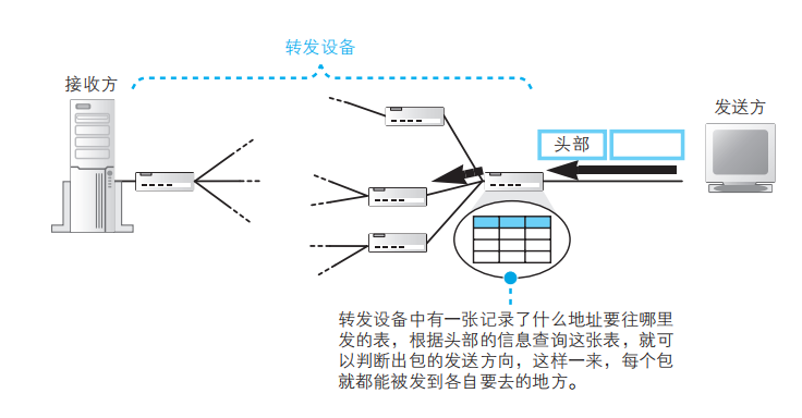 首先,包是由头部和数据两部分构成的(图a)。头部包含目的地址等控制信息,大家可以把它理解为快递包裹的面单;头部后面就是委托方要发送给对方的数据,也就相当于快递包裹里的货物。一个包发往目的地的过程如图所示。 首先,发送方的网络设备会负责创建包,创建包的过程就是生成含有正确控制信息的头部,然后再附加上要发送的数据。接下来,包会被发往最近的网络转发设备。当到达最近的转发设备之后,转发设备会根据头部中的信息判断接下来应该发往哪里。这个过程需要用到一张表,这张表里面记录了每一个地址对应的发送方向,也就是按照头部里记录的目的地址在表里进行查询,并根据查到的信息判断接下来应该发往哪个方向。