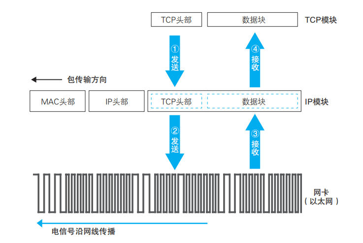 接下来,封装好的包会被交给网络硬件(图②发送),例如以太网、无线局域网等。网络硬件可能是插在计算机主板上的板卡,也可能是笔记本电脑上的 PCMCIA 卡,或者是计算机主板上集成的芯片,不同形态的硬件名字也不一样,我们在这里称为网卡。传递给网卡的网络包是由一连串 0 和 1 组成的数字信息,网卡会将这些数字信息转换为电信号或光信号,并通过网线(或光纤)发送出去,然后这些信号就会到达集线器、路由器等转发设备,再由转发设备一步一步地送达接收方。包送达对方之后,对方会作出响应。返回的包也会通过转发设备发送回来,然后我们需要接收这个包。接收的过程和发送的过程是相反的,信息先以电信号的形式从网线传输进来,然后由网卡将其转换为数字信息并传递给 IP 模块(图③接收)。接下来,IP 模块会将 MAC 头部和 IP 头部后面的内容,也就是 TCP 头部加上数据块,传递给 TCP 模块。接下来的操作就是我们之前讲过的 TCP 模块负责的部分了。在这个过程中,有几个关键的点。TCP 模块在收发数据时会分为好几个阶段,并为各个阶段设计了实现相应功能的网络包,但 IP 的包收发操作都是相同的,并不会因包本身而有所区别。因为 IP 模块会将 TCP 头部和数据块看作一整块二进制数据,在执行收发操作时并不关心其中的内容,也不关心这个包是包含 TCP 头部和数据两者都有呢,还是只有 TCP 头部而没有数据。当然,IP 模块也不关心 TCP 的操作阶段,对于包的乱序和丢失也一概不知。总之,IP 的职责就是将委托的东西打包送到对方手里,或者是将对方送来的包接收下来,仅此而已。因此,接下来我们要讲的这些关于 IP 的工作方式,可适用于任何 TCP 委派的收发操作。