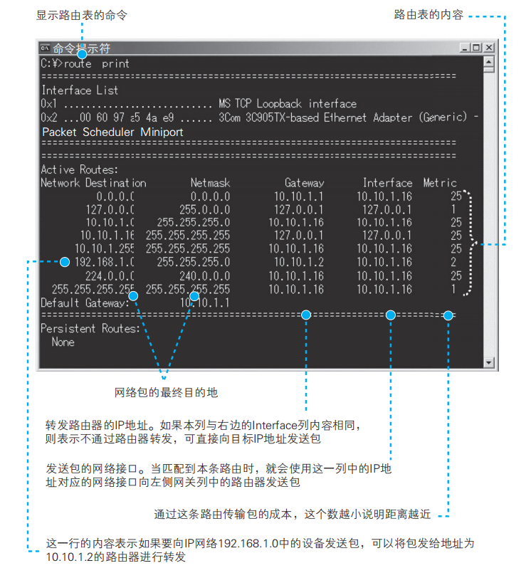 首先,我们对套接字中记录的目的地 IP 地址与路由表左侧的 Network Destination 栏进行比较,找到对应的一行。例如,TCP 模块告知的目标 IP 地址为 192.168.1.21,那么就对应图中的第 6 行,因为它和 192.168.1 的部分相匹配。如果目标 IP 地址为 10.10.1.166,那么就和 10.10.1 的部分相匹配,所以对应第 3 行。以此类推,我们需要找到与 IP 地址左边部分相匹配的条目 B,找到相应的条目之后,接下来看从右边数第 2 列和第 3 列的内容。右起第 2 列,也就是Interface 列,表示网卡等网络接口,这些网络接口可以将包发送给通信对象。此外,右起第 3 列,即 Gateway 列表示下一个路由器的 IP 地址,将包发给这个 IP 地址,该地址对应的路由器就会将包转发到目标地址 。路由表的第 1 行中,目标地址和子网掩码都是 0.0.0.0,这表示默认网关,如果其他所有条目都无法匹配,就会自动匹配这一行。