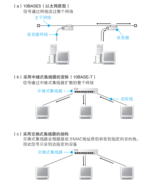 在使用集线器的半双工模式以太网中,一台设备发送的信号会到达连接在集线器上的所有设备。这意味着无论是不是发给自己的信号都会通过接收线路传进来,因此接收操作的第一步就是不管三七二十一把这些信号全都收进来再说(有交换机的情况下情况会不同)。
