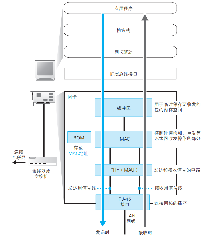 下面来看看以太网的包收发操作。IP 生成的网络包只是存放在内存中的一串数字信息,没有办法直接发送给对方。因此,我们需要将数字信息转换为电或光信号,才能在网线上传输,也就是说,这才是真正的数据发送过程。 负责执行这一操作的是网卡,但网卡也无法单独工作,要控制网卡还需要网卡驱动程序。驱动程序不只有网卡才有,键盘、鼠标、显卡、声卡等各种硬件设备都有。当然,不同厂商和型号的网卡在结构上有所不同, 因此网卡驱动程序也是厂商开发的专用程序。