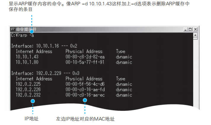 方便起见,我们按照从下往上的顺序来对表进行讲解。首先是“以太类型”,这里填写表示 IP 协议的值 0800(十六进制)。接下来是发送方 MAC 地址,这里填写网卡本身的 MAC 地址。MAC 地址是在网卡生产时写入 ROM 里的,只要将这个值读取出来写入 MAC 头部就可以了。对于多块网卡的情况,请大家回想一下设置发送方 IP 地址的方法。设置发送方 IP 地址时, 我们已经判断出了从哪块网卡发送这个包,那么现在只要将这块网卡对应的 MAC 地址填进去就好了。 前面这些还比较简单,而接收方 MAC 地址就有点复杂了。只要告诉以太网对方的 MAC 的地址,以太网就会帮我们把包发送过去,那么很显然这里应该填写对方的 MAC 地址。然而,在这个时间点上,我们还没有把包发送出去,所以先得搞清楚应该把包发给谁,这个只要查一下路由表就知道了。在路由表中找到相匹配的条目,然后把包发给 Gateway 列中的IP 地址就可以了。 既然已经知道了包应该发给谁,那么只要将对方的 MAC 地址填上去就好了,但到这里为止根本没有出现对方的 MAC 地址,也就是说我们现在根本不知道对方的 MAC 地址是什么。因此,我们还需要执行根据 IP 地址查询 MAC 地址的操作