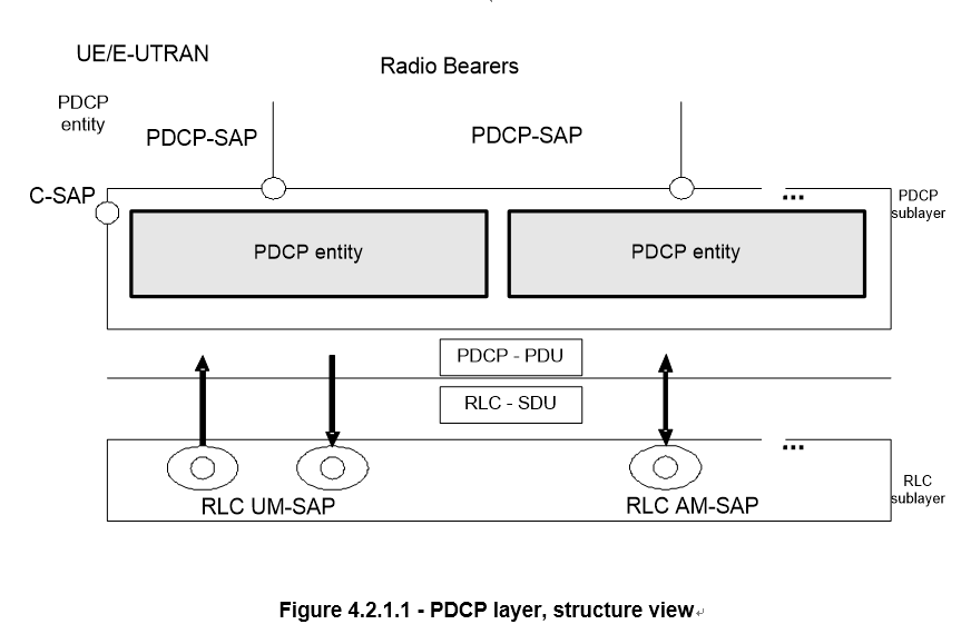 参考 36323 4.2.1 每个RB承载(i.e. DRB, SLRB and SRB, except for SRB0 and SRB1bis)都会有一个PDCP实体与其关联,同时,根据RB承载的特性,一个PDCP实体又可以关联一个或两个RLC实体。For LWA bearers, each PDCP entity is associated with an AM RLC entity and the LWAAP entity. The PDCP entities are located in the PDCP sublayer。