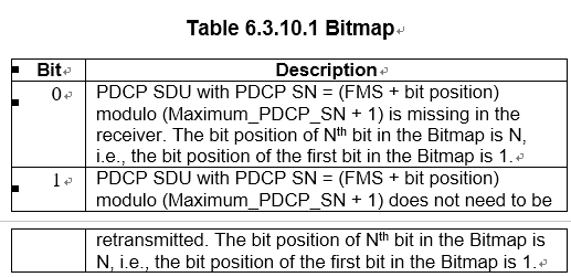 FMS:指示PDCP SN of the first missing PDCP SDU,第一个丢失的 SDU的SN序列号,对不同的PDCP SN序列长度,改字段长度不同。