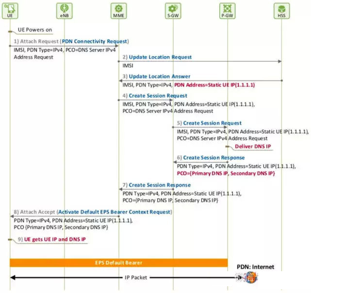 (6)UE终端获取IP地址后,就可以通过IP数据包与数据网关P-GW进行通信了。