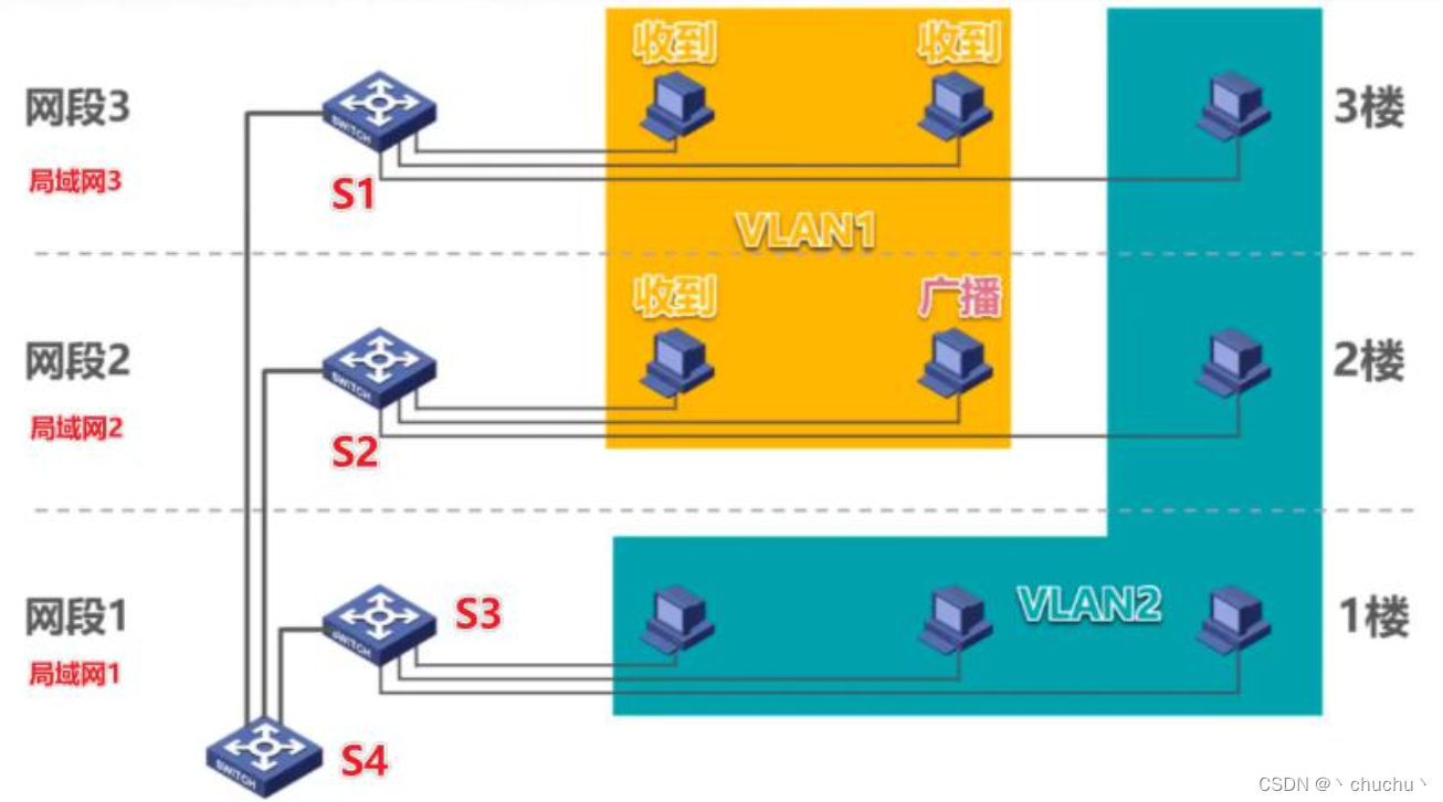 我们还可以用虚拟局域网VLAN来划分,如下图: