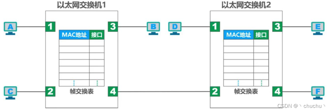 - 数据从A进入交换机1,交换机1的帧交换表记住了A对应接口1