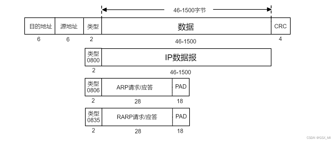 - 此外,以太网规定MAC帧中数据的最小长度为46字节,如果发送数据量小于46字节,则需要在数据后面补填充位,比如ARP数据包的长度就是不够46字节的