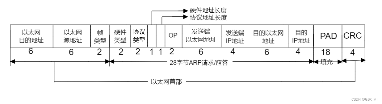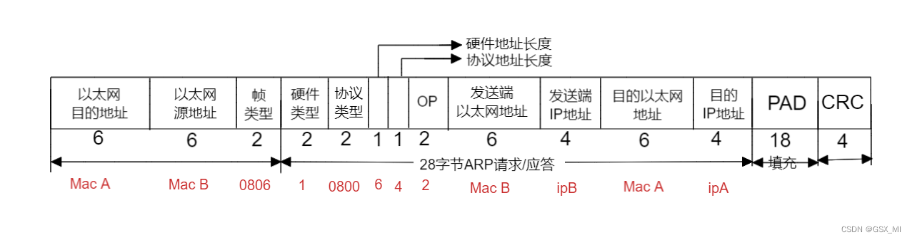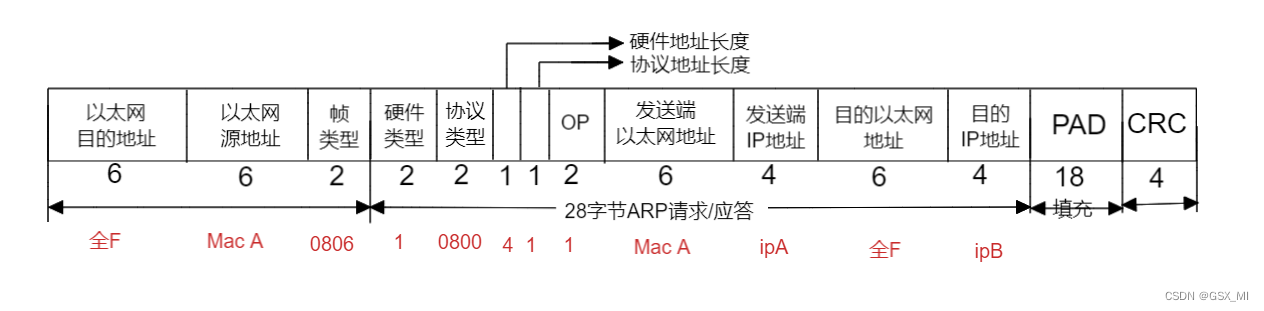 - 硬件地址长度对于以太网地址为6字节,因为MAC地址是48位的。