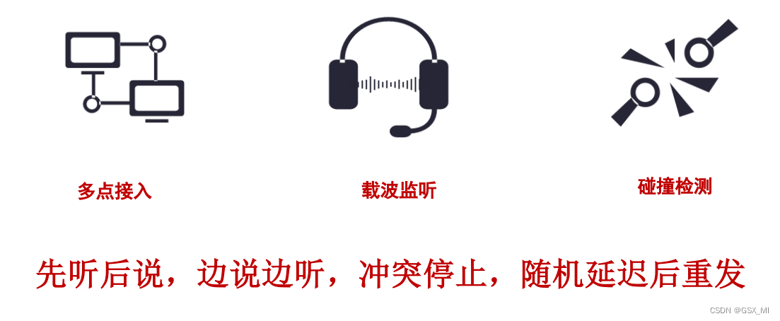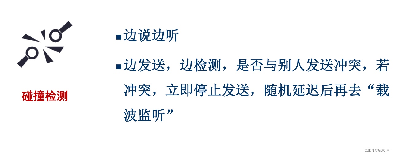 ②局域网相当于一个教室。每个人站起来说一句话所有人都能听见,张三和李四通话其他人也能听见。老师提问某个同学就相当于进行了一次网络通信(当然其他人也听到了但是没站起来);正在提问时有两个同学在讨论其他的话题,我们彼此会有干扰(这叫数据碰撞), 导致彼此之间谁都无法通信。会产生垃圾数据,被所有人识别,发送的主机会进行检测再发送(这叫局域网的碰撞检测); 重新发的过程仍有可能发生碰撞,要避免碰撞,而且在不断的检测有没有人发。碰撞避免之后还有可能碰撞但是概率降低。(虽然是单对单通信,但是其他人都听到了,但是其他人没有站起来是因为他们知道不是叫自己的)