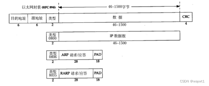 ● 以太网帧中的数据长度规定最小是46字节,最大1500字节,ARP数据包的长度不够46字节,要在后面补上填充位;