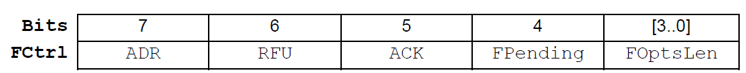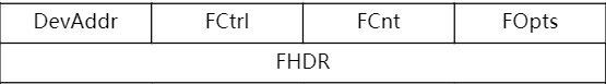 - FHDR是由4字节终端地址(DevAddr)、1字节帧控制字节(FCtrl)、2字节帧计数器(FCnt)和用来传输MAC命令的帧选项(FOpts,最多15个字节)组成。