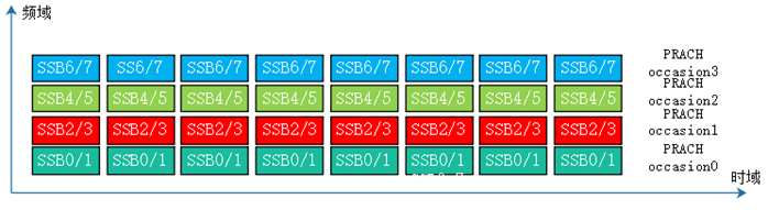 图21.8中表示的是,ssb-perRACH-Occasion = 2,表示8个SSB映射1个PRACH occasion,因此在第一个时域PRACH occasion上的4个频域PRACH occasion都映射SSB 0~7,依此类推。