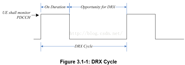 在这个图中,标识“On Duration”的这段时间是UE监控下行PDCCH子帧的时间,在这段时间里,UE是处于唤醒状态的。