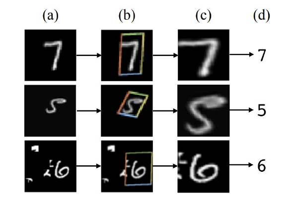 - MNIST中的数字,是经过随机平移、缩放和旋转处理;把它们输入到STN网络中;