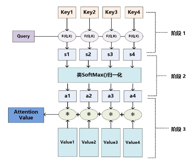 三阶段的注意力机制计算流程: