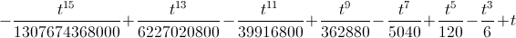 - frac{t^{15}}{1307674368000} + frac{t^{13}}{6227020800} - frac{t^{11}}{39916800} + frac{t^9}{362880} - frac{t^7}{5040} + frac{t^5}{120} - frac{t^3}{6} + t