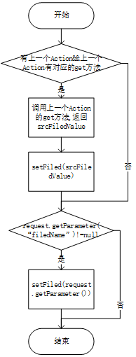 如果有对应的请求参数值,则这种情况一定会发生,及时上一种情况已经发生过了。这样,如果源Action有对应的get方法,请求中也有对应的请求参数值(注意是getParameter到的值,而不是getAttribute到的值,Action是不能从request的Attribute中得到属性值的),则一个get方法会被调用两次,后面一次获取的是请求参数中的值,最终的属性值和请求参数一致。