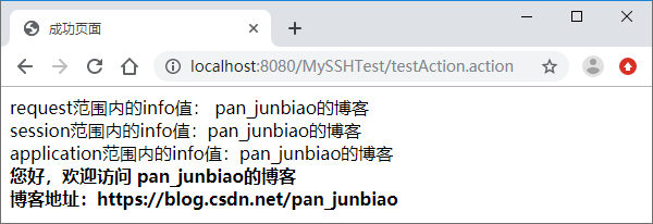 (4)创建TestAction处理成功后的返回页面success.jsp,在该页面总分别从JSP内置对象request、session、application中获取info属性的值,并将这些输出到JSP页面中。