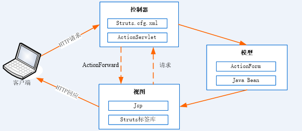 到目前为止,Struts框架拥有两个主要的版本,分别为Struts1.x版本与Struts2.x版本,它们都是遵循MVC设计理念的开源Web框架。在2001年6月发布了Struts1.0版本,它是基于MVC设计理念而开发的Java Web应用框架,其MVC架构如下图所示: