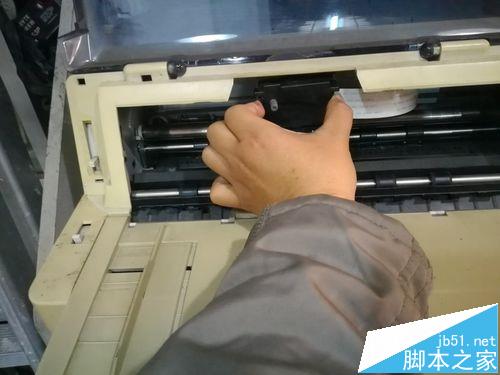 1、把DPK8300E/DPK8300E+的色带架从打印机里拿出来。把打印头拨到中间有个缺口那,压住色带架上的两个小耳朵就可以把色带架拿下来了。