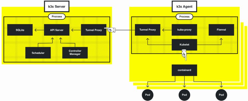 事实上,K3S 就是基于一个特定版本 Kubernetes(例如:1.13)直接做了代码修改。K3S 分 Server 和 Agent,Server 就是 Kubernetes 管理面组件 + SQLite 和 Tunnel Proxy,Agent 即 Kubernetes 的数据面 + Tunnel Proxy。