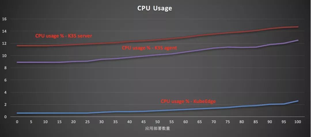 分别用 KubeEdge 和 K3S 部署 0~100 个应用,分别观测两者的 CPU 使用情况,对比如下所示: