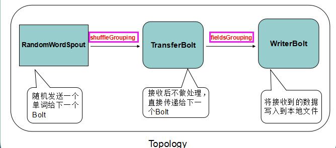 一个topology是spouts和bolts组成的图, 通过stream groupings将图中的spouts和bolts连接起来,如下图: