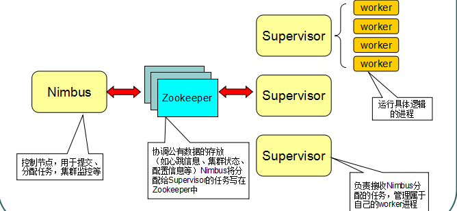 (1)Nimbus和Supervisor之间的所有协调工作都是通过Zookeeper集群完成。: (2)Nimbus进程和Supervisor进程都是快速失败(fail-fast)和无状态的。所有的状态要么在zookeeper里面, 要么在本地磁盘上。 (3)这也就意味着你可以用kill -9来杀死Nimbus和Supervisor进程, 然后再重启它们,就好像什么都没有发生过。这个设计使得Storm异常的稳定。