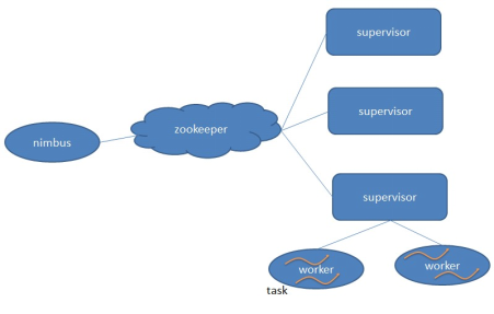 Nimbus:负责资源分配和任务调度。Nimbus任务分配,对任务监控。 Supervisor:负责接受nimbus分配的任务,启动和停止属于自己管理的worker进程。---通过配置文件设置当前supervisor上启动多少个worker。Supervisor当前物理机器上的管理者,接受Nimbus分配的任务,启动自己的Worker,Worker数量是根据端口号来的。 Worker:运行具体处理组件逻辑的进程。Worker运行的任务类型只有两种,一种是Spout任务,一种是Bolt任务。Worker执行具体任务的组件,任务类型有两种,分别是Spout任务,bolt任务,一个worker中可能同时存在多个spout任务和多个bolt任务。 Task:worker中每一个spout/bolt的线程称为一个task. 在storm0.8之后,task不再与物理线程对应,不同spout/bolt的task可能会共享一个物理线程,该线程称为executor。Task是Spout任务,bolt任务,每个Task属于某个组件并发度中的一个。一个Task本质是一个线程。
