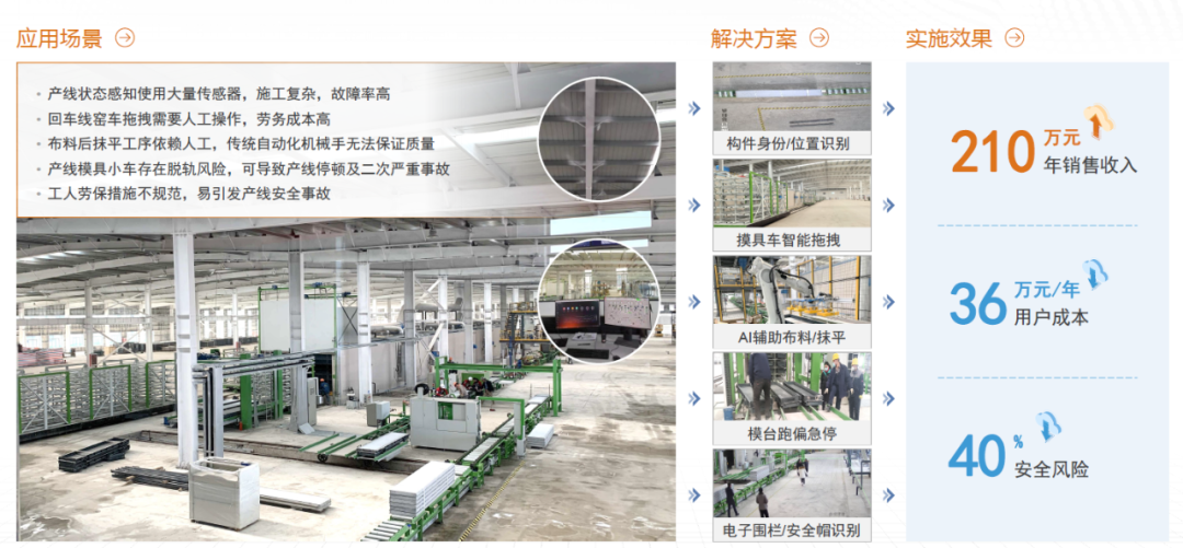 第四点是工业相机的使用,是对生产设备是否脱轨进行快速检测,对于进入生产区域的工人进行检测,看着装、劳保措施是否规范。通过这样的实施效果,这个方案基本实现产线的自动化,产量上升,收入上升200多万,人工成本减少36万。整个生产区域人减少了,安全风险降低了40%。