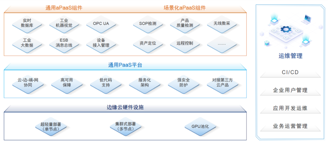 再往上是aPaaS组件。区分为两大类,第一大类是通用能力组件。比如工业机器视觉、消息总线、数据库等,它们会被频繁使用,而不是在场景化的条件下。还有一类称之为场景化组件,这些组件很可能只在特定场景下用于一两个工位。通过这样的方式区分,在实现某个SaaS应用的时候可以提取一部分通用组件,再结合一部分场景化组件,快速组装出一个工业SaaS应用。这是艾灵网络做组件分类的想法。除此之外,边缘云在工业现场必须能够达到极简使用,这不是对IT工程师达到极简使用,而是对OT工程师达到极简使用,还要能提供运维管理能力,这种能力不是大型数据中心及云计算平台要求的管理能力,应该比它更加傻瓜、简单易用,这意味着要把大量底层配置全部屏蔽掉,且封装成OT工程师非常容易理解上手的工具,这必须要对工业场景有极其深刻的理解和认识才能做到。
