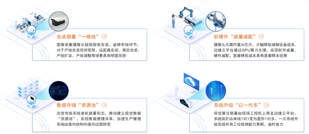 第二,软硬件减量减配。为什么AI摄像头不太适用工业场景,尤其是工业现场。因为工业现场,从机器学习角度来说,是典型的小样本训练场景。现在很多AI摄像头都在做人脸识别,人脸数据库非常多。但工业现场恰恰相反,对某一个工厂来说不可能预先从别的工厂拿来数据在本工厂用。做工业视觉部署的时候要在实施工业现场做样本采集、标注,这个样本采集数量远远没有办法匹配to C数据,所以就是小样本训练。对于传统AI厂商会面临什么问题呢?通常就是厂商在摄像头里内制一个AI芯片,芯片支撑的算法能力非常有限,而且都是临时提取小样本的数据,意味着这些数据要进行重新训,训练完再下载到AI芯片里,而AI芯片算力通常有限,很多复杂的模型往往无法支撑。如果通过普通摄像头+5G+边缘云端用GPU的方式来做会有什么好处呢?首先,基于GPU的工具链极其丰富,通常最新模型都最先支持在GPU平台运行。这就意味着,对于小样本数据集来说,如果是基于GPU的平台,可以灵活适用不同模型,找到最适合的模型使用。其次,GPU提供的算力相对嵌入式AI芯片来说,更为丰富,因此即使模型较复杂,通常也能在GPU平台上运行起来。
