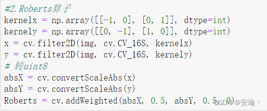 在Python中,Roberts算子主要通过numpy定义模板,再调用OpenCV的 filter2D() 函数实现边缘提取。该函数主要是利用内核实现对图像的卷积运算。filter2D() 函数用法如下所示: