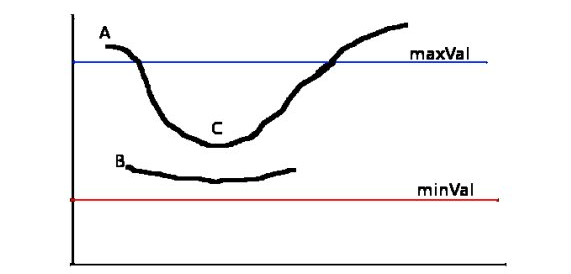 现在要确定哪些边界才是真正的边界。这时我们需要设置两个阈值:minVal 和 maxVal。当图像的灰度梯度高于 maxVal 时被认为是真的边界,那些低于 minVal 的边界会被抛弃。如果介于两者之间的话,就要看这个点是否与某个被确定为真正的边界点相连,如果是就认为它也是边界点,如果不是就抛弃。如下图: