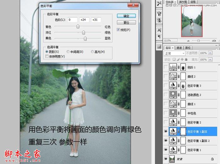 3、调整【色彩平衡】,将画面调整为青绿色,反复微调整,由于每张图片不同,要调整为你感觉最适合的颜色为止。