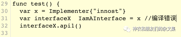 30行定义了x结构体变量。第31行将x赋值给interfaceX变量。32行针对这个interfaceX调用它的api1函数。结果编译错误——原因是上图中我们定义的receiver是指针类型。而interfaceX不是指针。OK,可以“理解”。接着看下一个代码:
