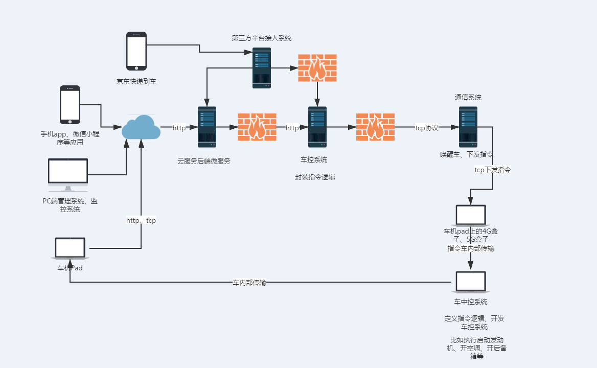 现在的网联车,都可以实现远程app、微信小程序控制车。它的实现逻辑每个车厂都不一样,大概可以划分为前端应用有手机app、微信小程序、PC管理系统、监控系统、车机PAD。app、小程序等那些应有的级别功能,用户登录注销认证等就不说了,主要围绕着车控相关的实现说起。比如你在公司,你的车停在了马路边暴晒,你想远程启动你的车,开个空调,然后你走过去开车的时候,车内就凉了。这个时候可以通过app上的界面点击开空调,设置度数。app会把这些数据加密加签名通过http请求发送到云服务后端服务器,云服务后端服务器解密验证签名,走内部微服务,车控微服务组装数据经过防火墙调用车控系统的接口,车控系统再验证签名解密数据组装数据,然后通过tcp协议与通信系统交互,通信系统接收到报文,把下令下发到车机上的PAD的4G盒子,4G盒子把指令传给车中控系统,车中控系统对车进行操作,车执行了操作指令,返回给4G盒子,4G盒子传结果给车机上的PAD,车机上的PAD通过http协议回调返回结果接口给车控系统,车控系统提供查询车状态的接口。app可以再调云服务后端接口查询结果,云服务去调车控系统的接口获取结果。 大概的交互逻辑就这样,没什么复杂的,无非就是实时返回或轮询获取,回调、tcp实时推送等。安全方面,一定要加密加签名。