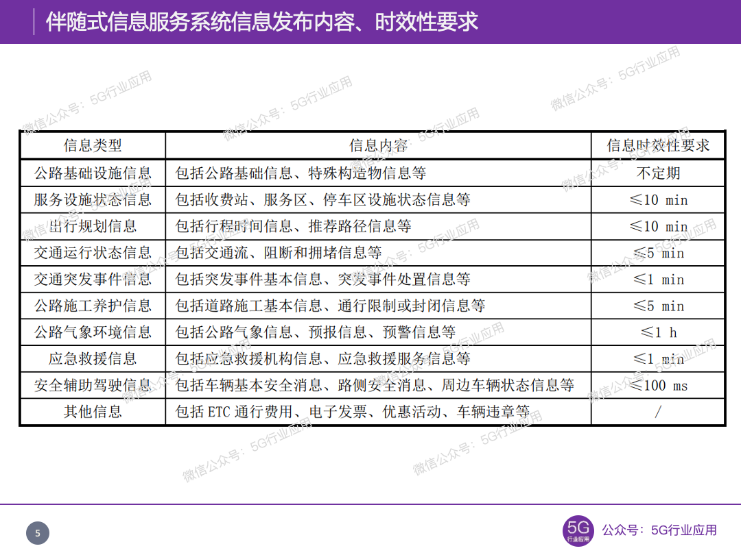 通讯延时的选择标准如下:考虑现有的通信技术,对通信时延的要求划分为下列四档:a)50ms,LTE-V控制面的上极限,高密度环境下,如采用单一或中低容量的V2I设备,则延时会显著提升,需要5G或高容量LTE-V/DSRC设备;b)100ms,中低等容量LTE-V设备可保证;c)150ms,常规LTE-V路侧通信单元即可;d)200ms,现有4G网络即可满足。