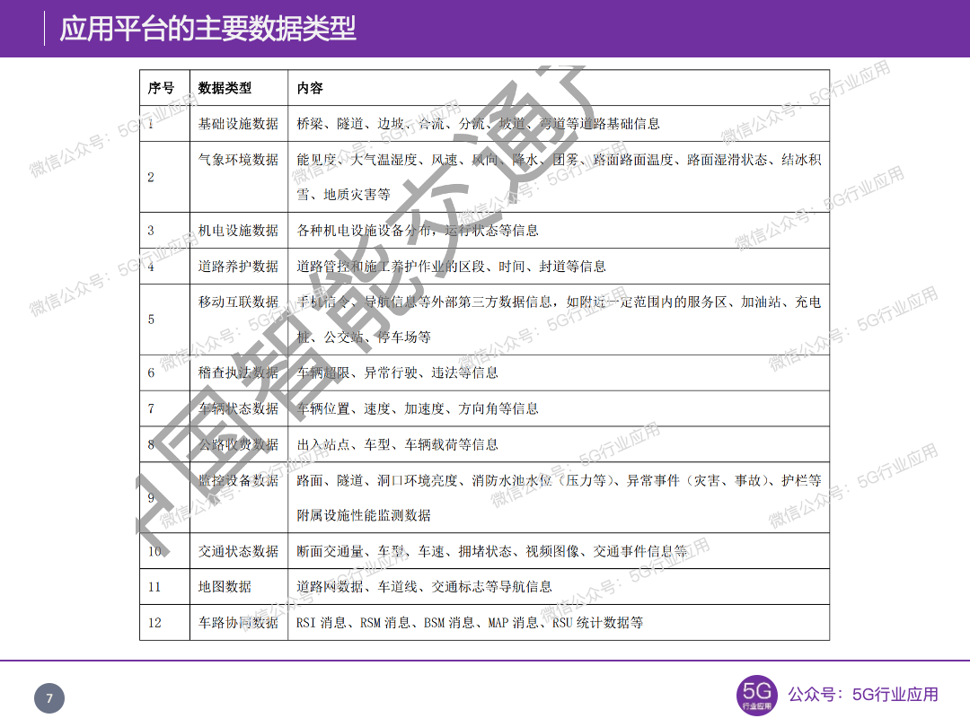 应用平台采集所属路段的车载终端和路侧设备的上传数据,并可接收第三方提供的数据,主要数据类型包括但不限于下表的内容。