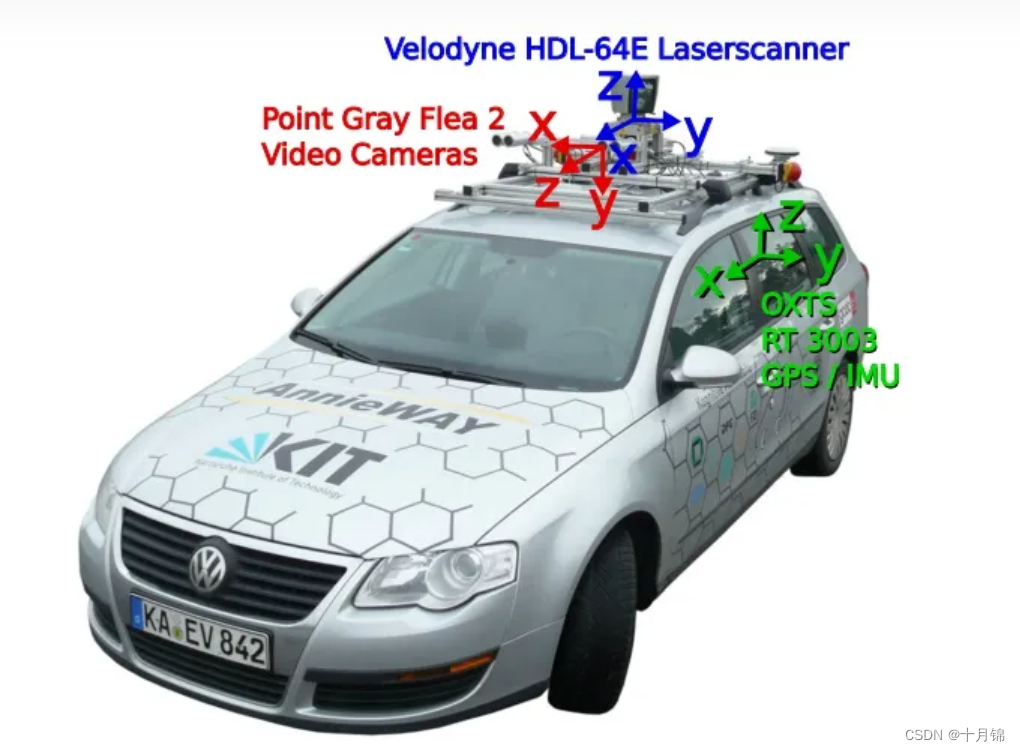 1.采集平台的组成:64线激光雷达(车顶中心)+四个摄像头(激光雷达两侧没测一个彩色一个灰色)+组合导航系统(雷达左后方,输出RTK/IMU组合导航结果。经纬度、姿态、IMU原始数据)。由位置信息可以得到各个传感器之间以及他们和车的相对位移关系。