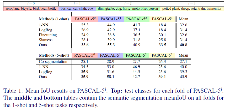 为了测试 k-shot Image Segmentation的结果,论文构建了一个数据集PASCAL-5i,其是从PASCALVOC 2012数据集(共20类)随机采样得来的。训练任务从15个类中进行采样,测试任务从剩下的5中采样。