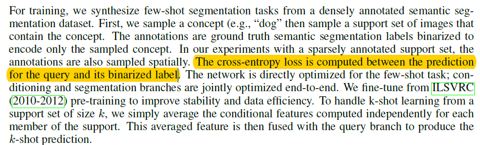 - 训练任务的要求:训练任务的support set与query set都需要给出分割的mask, support set 的mask是用于提供指导信息;query set mask用于计算预测损失,用于反向传播更新网络参数;