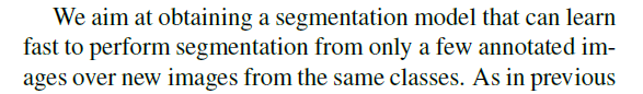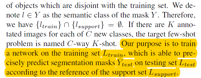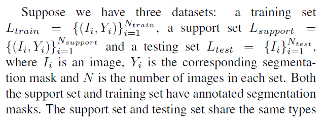 - 在测试任务上:通过利用很少的具有分割标签的support set 来获得query set上目标的分割结果;所以说对于query set 和 support set 两者的要求就是类别是相同的;