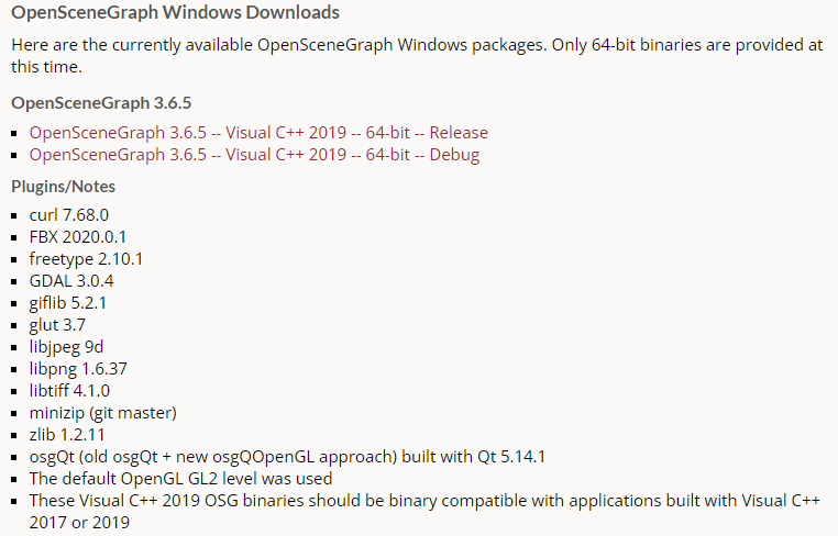 - 下载编译好的osg库。要想最快搭建osg的开发环境,推荐此方法。本文使用Objexx编译并提供给osg开源社区的osg库。 下载页面地址:https://objexx.com/OpenSceneGraph.html。