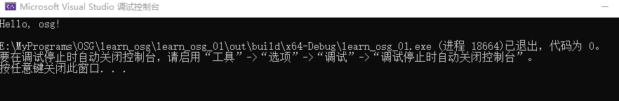 6.点击VS菜单的"生成-全部生成",VS会自动调用相关工具生成"learn_osg_01.exe",F5可运行调试,此时在控制台上已经可以输出"Hello, osg!"。