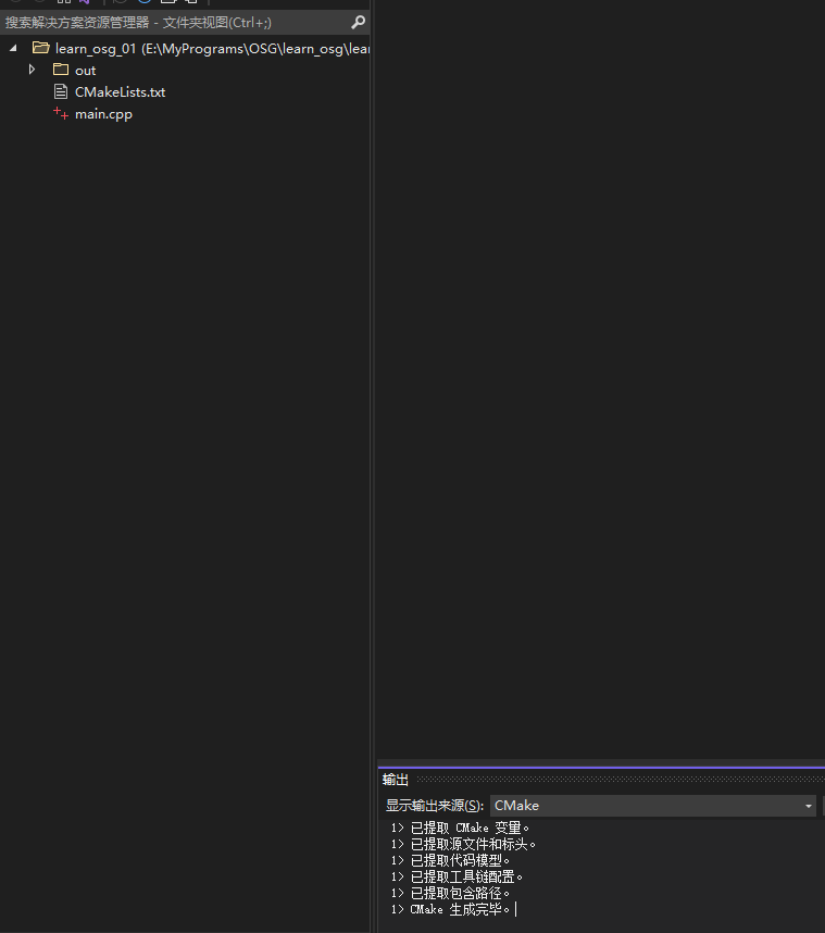 3.此时VS经过一番自动操作,完成了CMake工程的生成工作。可以发现此时在"learn_osg_01"目录下多了两个文件夹".vs"和"out",其中".vs"目录下会生成VS的项目配置、缓存等文件,由VS自动维护,我们可以不用关心,甚至可以在关闭工程时删除(再次打开VS还会重新生成);"out"目录下将存放将来编译、链接生成的各种文件。